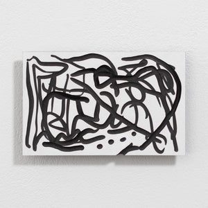 The black squiggles are free flowing paths, a chaos of movement, much like the accumulated touches on a smartphone's surface. The painting's shaped backs also refer to a technological device, an object to hold and imagine infinite potential.